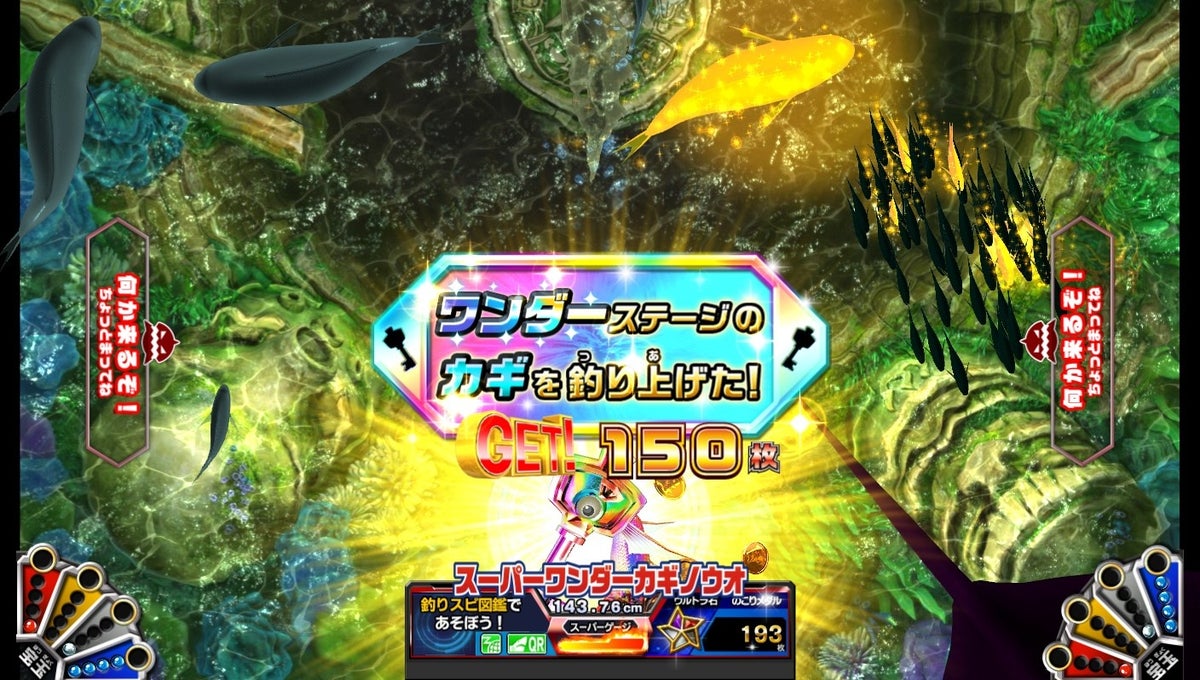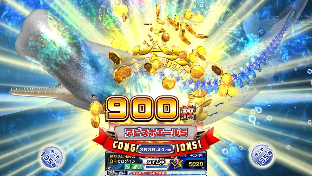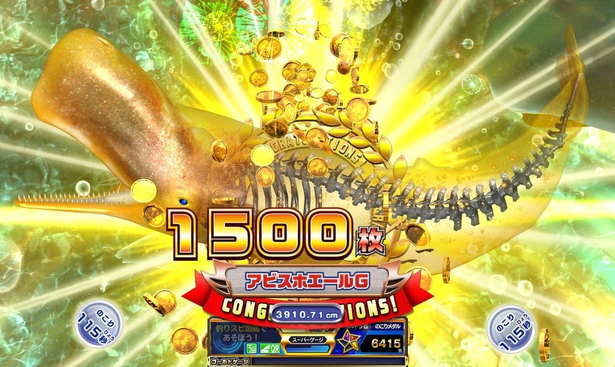 メダルのBET枚数と獲得枚数の倍率を変更することができる『ロッドモード』を切り替え、5倍モードで『アビスホエール』を釣りあげれば、一度に1,500枚のメダル獲得を狙うことができます。