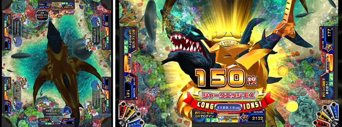『釣りスピリッツ 爆釣ファンブックVol.2』付録の、『∞バトルメダル』をゲームセンターの『釣りスピリッツ ワンダー』にかざすことで『シャークエッジ-EX』とバトルすることができます。『シャークエッジ-EX』に挑戦できるのは2026年5月31日(日)までの期間限定です。