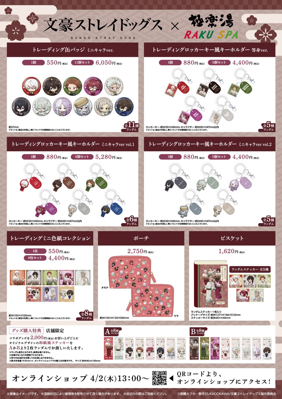 また、コラボグッズを2,000円(税込)ご購入ごとに、描き下ろしイラストや描き起こしミニキャライラストを使用した和紙風ステッカー(A:8種/B:8種)をA・Bいずれかからランダムで1枚お渡しします。