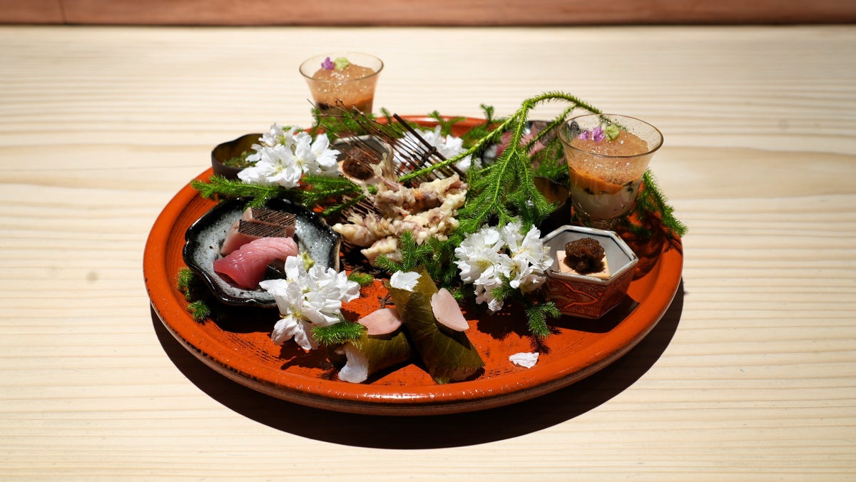 八寸には桜の花びらを散らし、さらに生姜を桜の花びらの形に切り出すなど、見た目にも春の季節感を表現。