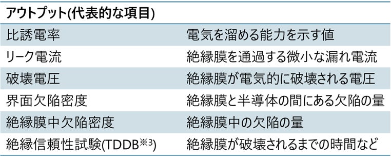 ※3 TDDB(Time Dependent Dielectric Breakdown、経時絶縁破壊):一定電圧下で絶縁膜が破壊されるまでの時間を多数回測定し、その結果を統計処理することで、絶縁膜の耐久性および長期信頼性を評価する試験。