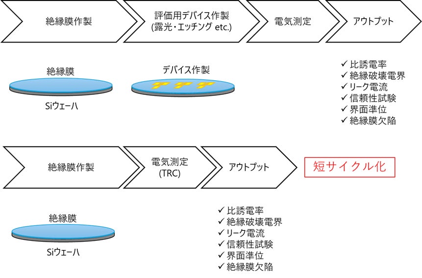 図1 絶縁膜の電気特性評価の流れ:上段 従来評価プロセス、下段 新規評価プロセス