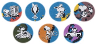 採鉱地はビーグルスカウト、博物館はハットと革靴スタイル、漁港はマリンルック、果樹園はハットスタイル、温泉はリラックスしたスヌーピーとウッドストック、ヤシ科樹林はサングラスをしたスヌーピーがサーフボードを持つスタイル、城跡はガイドブックを読んでいます。