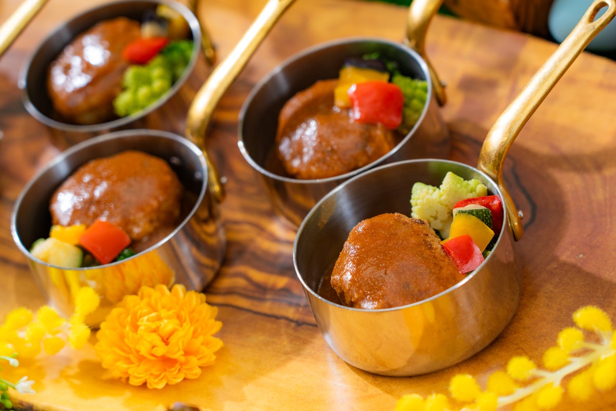 シェフのパフォーマンスで提供されるお肉の旨味を存分に堪能できる定番のローストビーフに加えて、100%ビーフのハンバーグをご提供。好みに合わせて選べるバンズ2種・チーズ・トマト・レタス・ピクルスを用意し、自分好みのハンバーガーをお作りいただけます。さらに、東京和牛の焼きしゃぶもディナー限定メニューとして登場いたします。