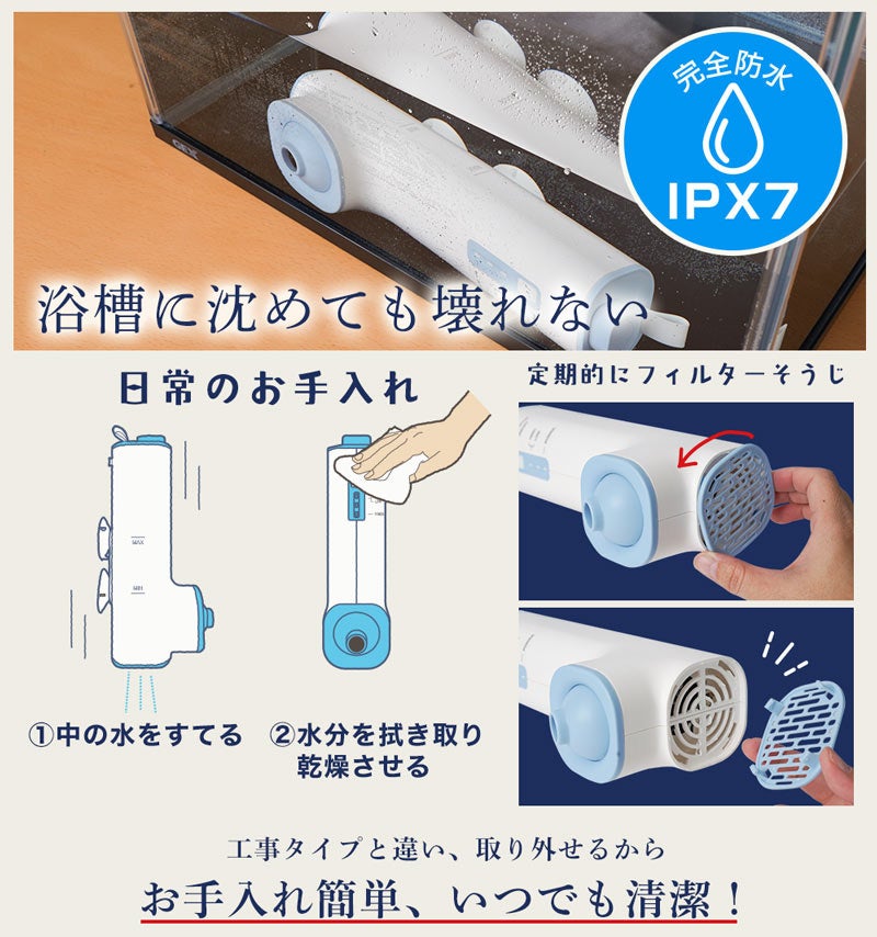 充電して吸盤で貼り付け、ボタンを押すだけの3ステップで、賃貸物件でも壁や風呂釜を傷つけることなく極上のスパ気分を味わえます。
