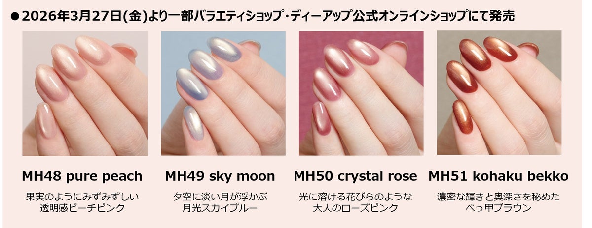 化粧品輸入製造の株式会社 ディー・アップ(本社:東京都港区 代表取締役:塩野 弘明)は、サロン級の美しいトレンドネイルをセルフで気軽に楽しめるジェルネイルブランド 『GELiSM(ジェリズム)』から、春の新色4色を2026年3月27日(金)より一部のバラエティショップおよびディーアップ公式オンラインショップで発売いたします。