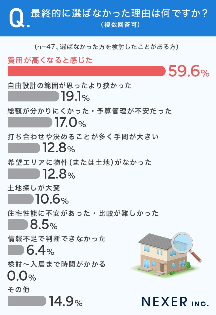 最も多かったのは「費用が高くなると感じた」で59.6%でした。次いで「自由設計の範囲が思ったより狭かった」が19.1%、「総額が分かりにくかった・予算管理が不安だった」が17.0%と続きます。