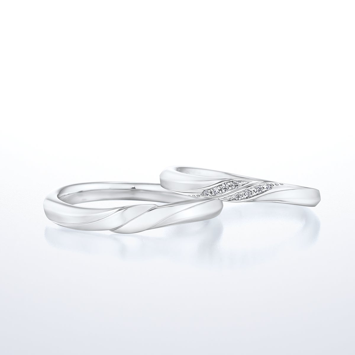 プラチナの立体感で結ばれたふたつのラインから、日常に溶け込みながらも確かにそこにある愛を感じられます。心地の良いウェーブ感と、メレダイヤモンド(*)の輝きですべてを愛で包み込むような柔らかさ(右)、角度の違う面の陰影により力強さとしなやかさを表現したリング(左)です。