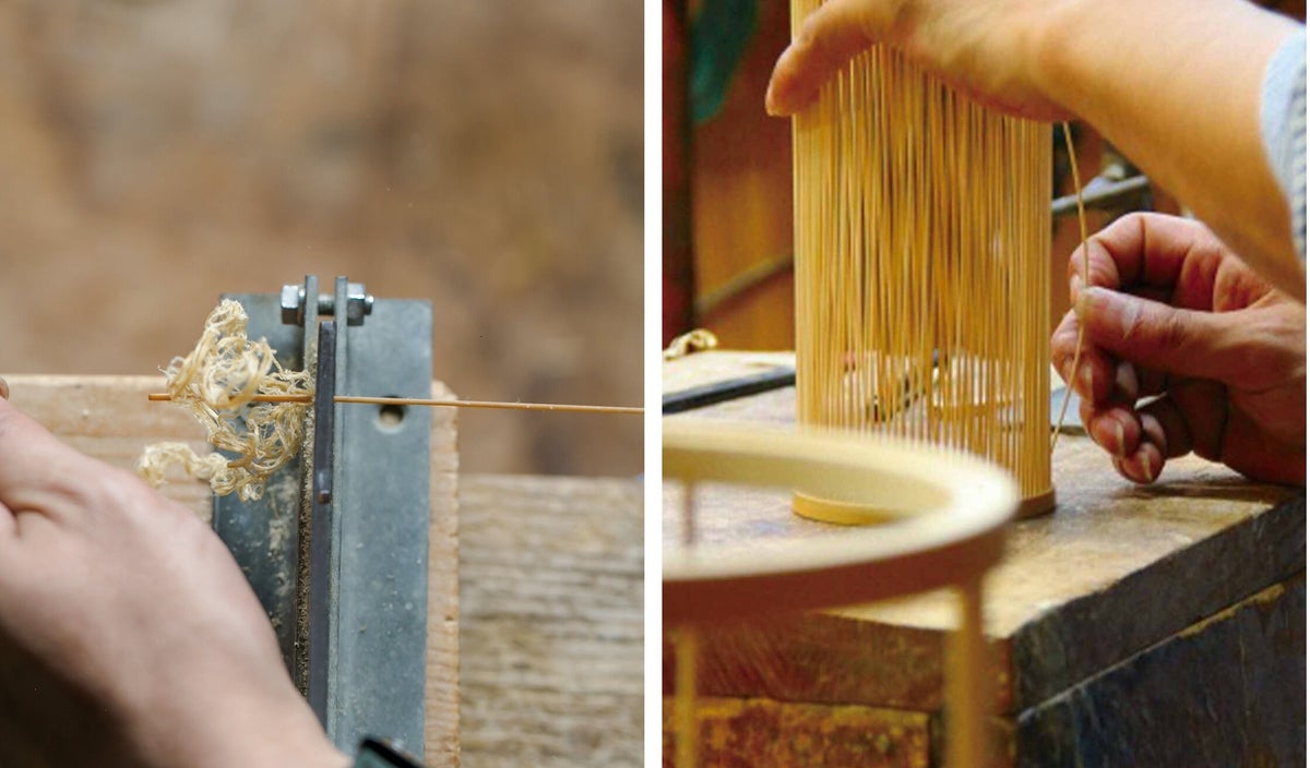 静岡県の竹細工職人の手で削り出された繊細な平ひごや丸ひご、竹枠を組み上げていきます。