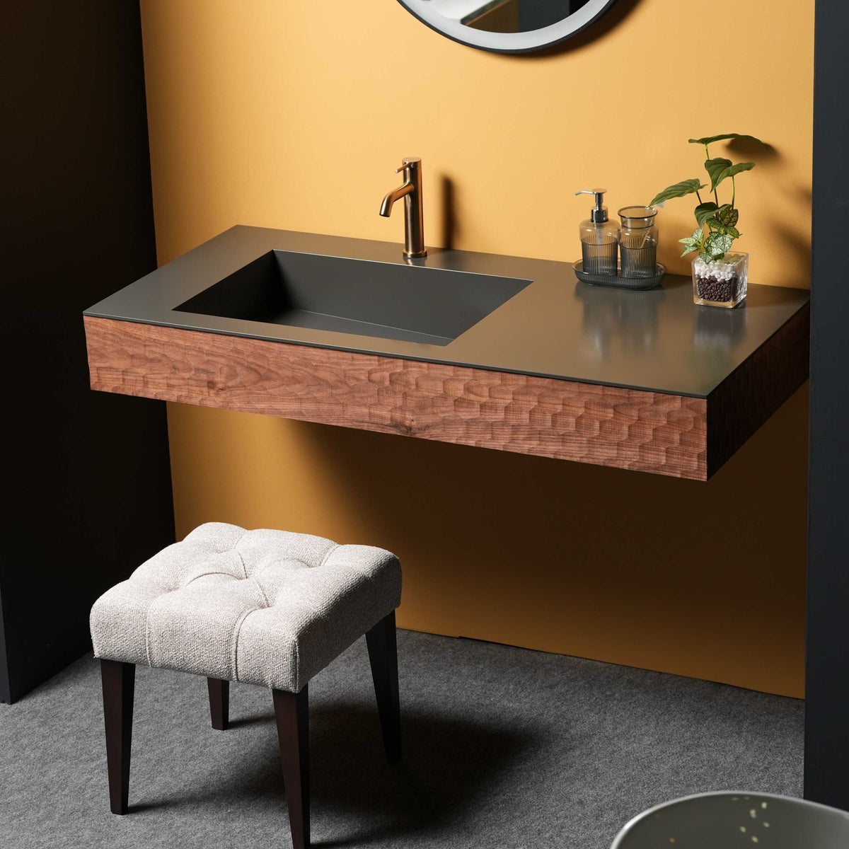 会場で初披露した『モルネオ』は、本物の左官仕上げならではのムラ感や雰囲気を、熟練の職人の手仕事で仕上げたメイドインジャパン品質の洗面台です。イタリア製の左官材「オルトレマテリア」を採用し、高機能かつ高い意匠性を実現した、一体感のある洗面提案が注目を集めました。