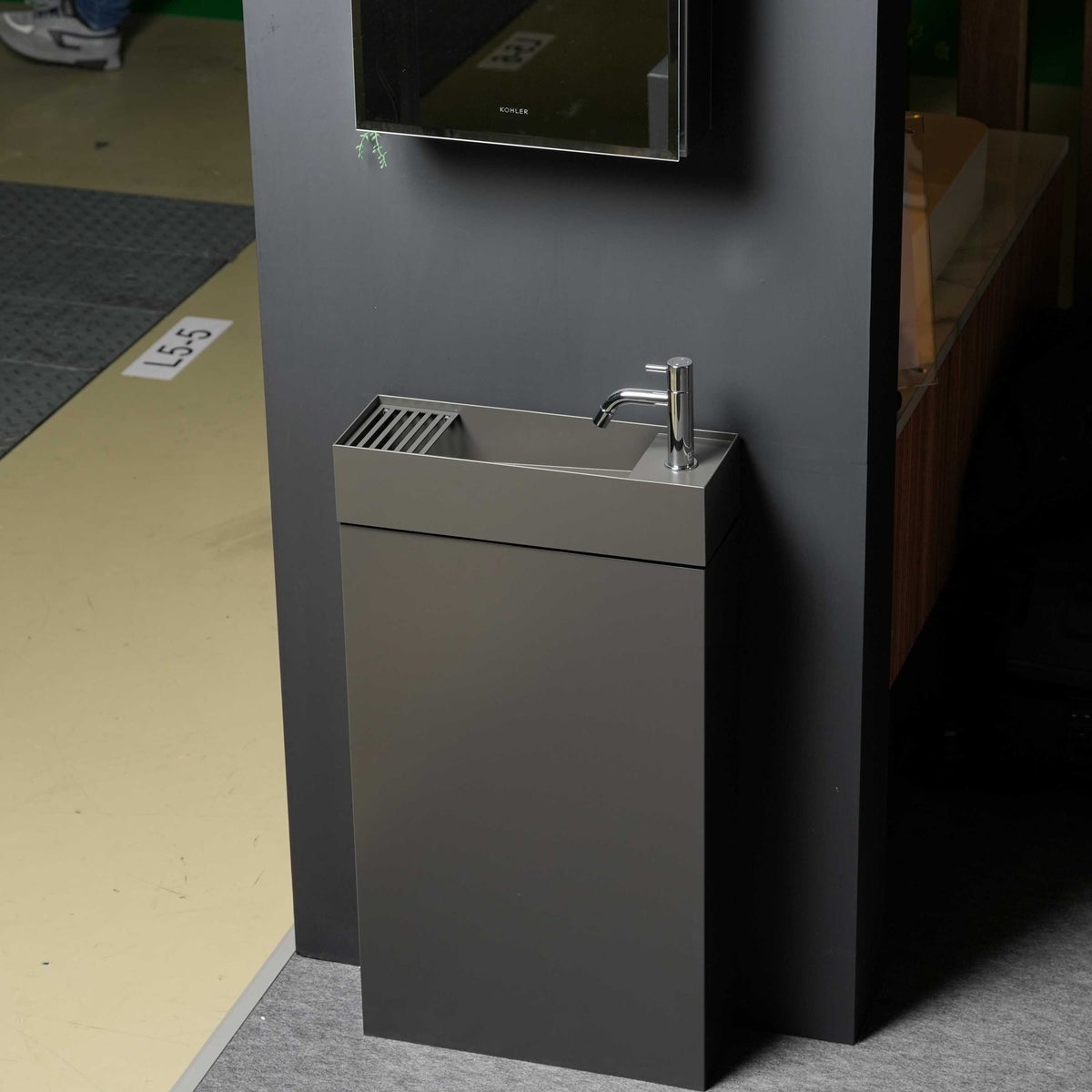 Piqua(ピクア):配管カバー付きモデルを展示。配管まわりをカバーすることで、よりミニマルな佇まいを実現しています。