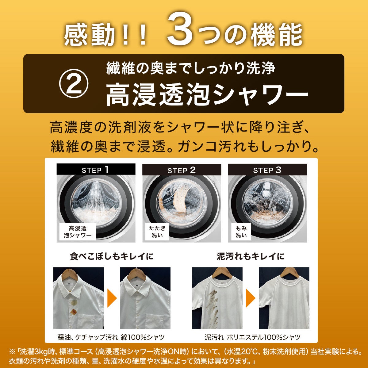 高濃度の洗剤液を泡シャワーで繊維の奥まで浸透させ、がんこな汚れもすっきり。
