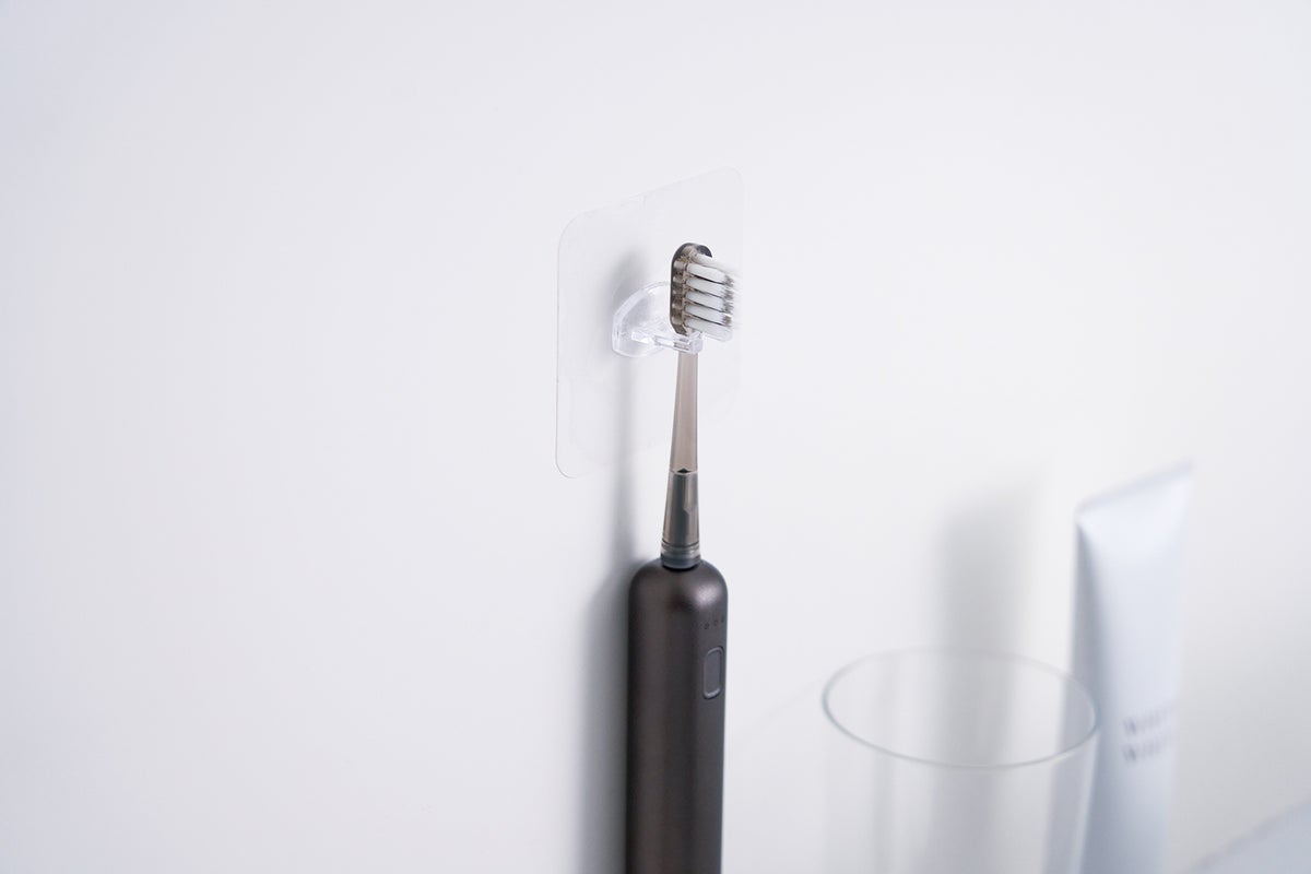洗面台の壁やタイルに貼り付けられる専用ホルダー付き。