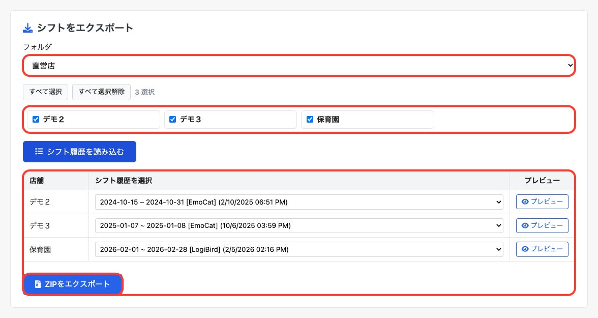 1. 全店舗のシフトを一覧で選択し、一括エクスポート