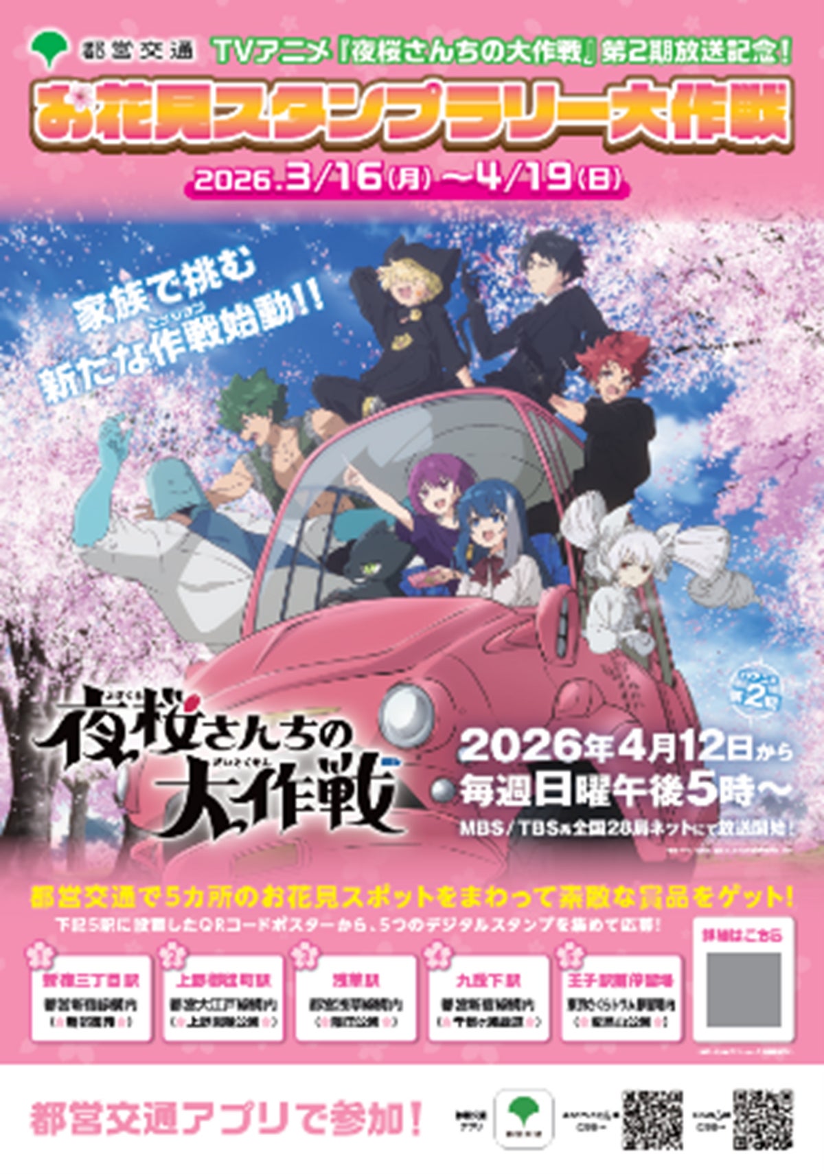 本キャンペーンは、2024年に放映を開始して人気を博したTVアニメ『夜桜さんちの大作戦』が、2026年4月12日から待望の第2期の放送をスタートすることを記念した、都営交通沿線の桜の名所を巡るデジタル版スタンプラリーです。