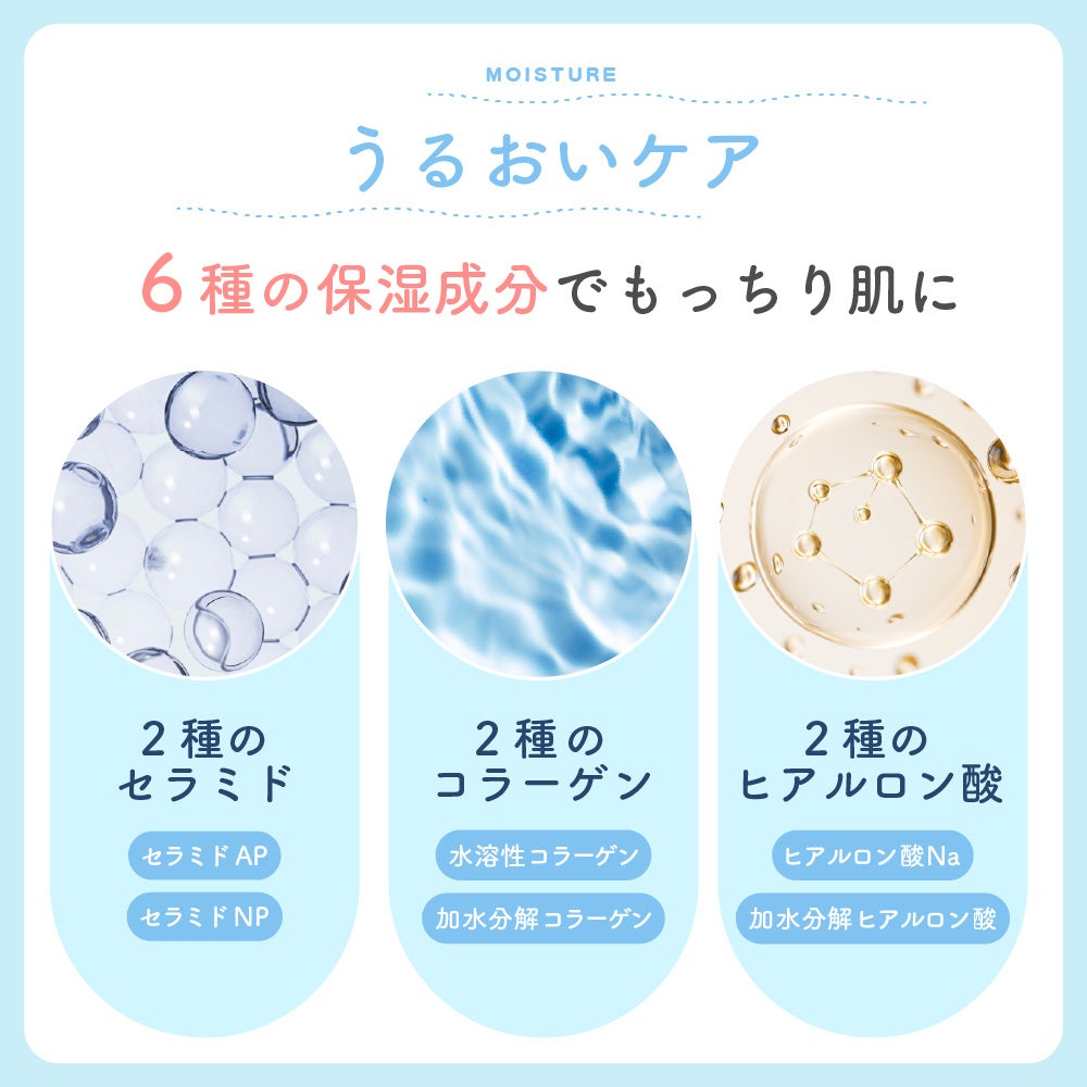 セラミドやヒアルロン酸、コラーゲンなどの保湿成分に加え、シアバターやスクワランなどのエモリエント成分を配合。乾燥が気になる肌にうるおいを与え、なめらかな肌へ整えます。