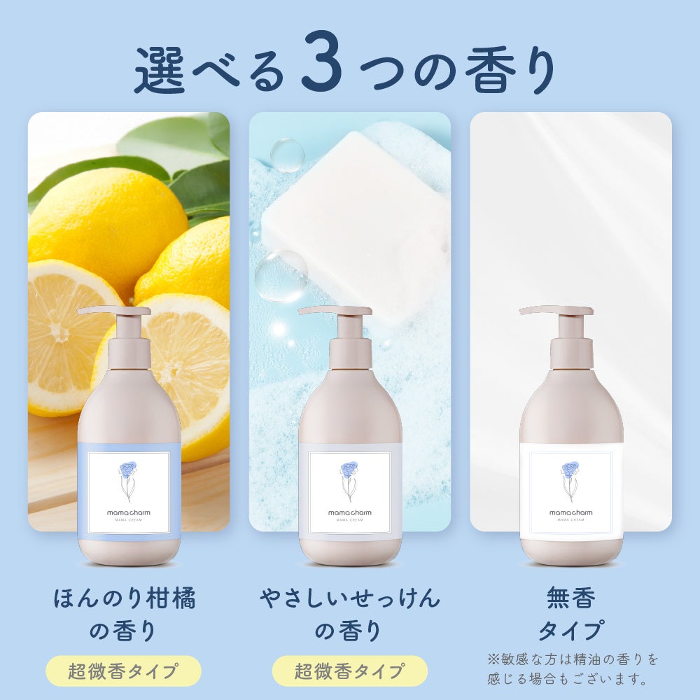 妊娠期の体調や好みに合わせて選べる、柑橘の香りとせっけんの香り、無香タイプの3種類展開をしています。