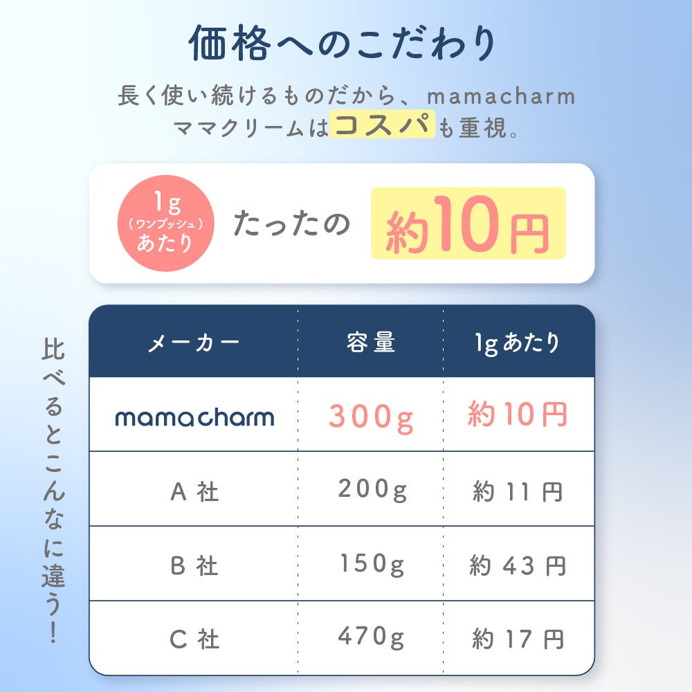 容量は300gの大容量タイプ。日々の保湿ケアとして惜しみなく使用でき、妊娠期から産後まで長く使いやすい設計です。
