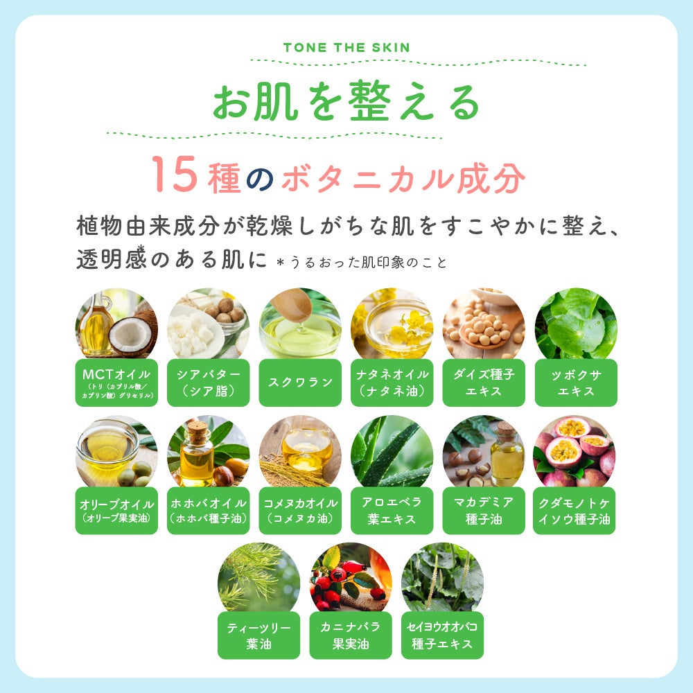 成分:水、グリセリン、BG、ナタネ油、コメヌカ油、ミリスチン酸ポリグリセリル-10、ジイソステアリン酸ポリグリセリル-2、トリ(カプリル酸/カプリン酸)グリセリル、PEG-60水添ヒマシ油、シア脂、オリーブ果実油、カニナバラ果実油、ホホバ種子油、スクワラン、マカデミア種子油、セタノール、セイヨウオオバコ種子エキス、アロエベラ葉エキス、ダイズ種子エキス、ヒアルロン酸Na、加水分解ヒアルロン酸、水溶性コラーゲン、加水分解コラーゲン、セラミドAP、セラミドNP、PCA-Na、乳酸Na、アルギニン、アスパラギン酸、PCA、グリシン、アラニン、セリン、バリン、プロリン、トレオニン、イソロイシン、ヒスチジン、フェニルアラニン、アラントイン、ツボクサエキス、クダモノトケイソウ種子油、水溶性プロテオグリカン、3-グリセリルアスコルビン酸、ティーツリー葉油、グレープフルーツ果皮油、レモン果皮油、マンダリンオレンジ果皮油、ベルガモット果実油、ステアリン酸グリセリル(SE)、カプリル酸グリセリル、キサンタンガム、カルボマー、エチルヘキシルグリセリン、フェノキシエタノール、クエン酸、クエン酸Na、水酸化Na、EDTA-2Na