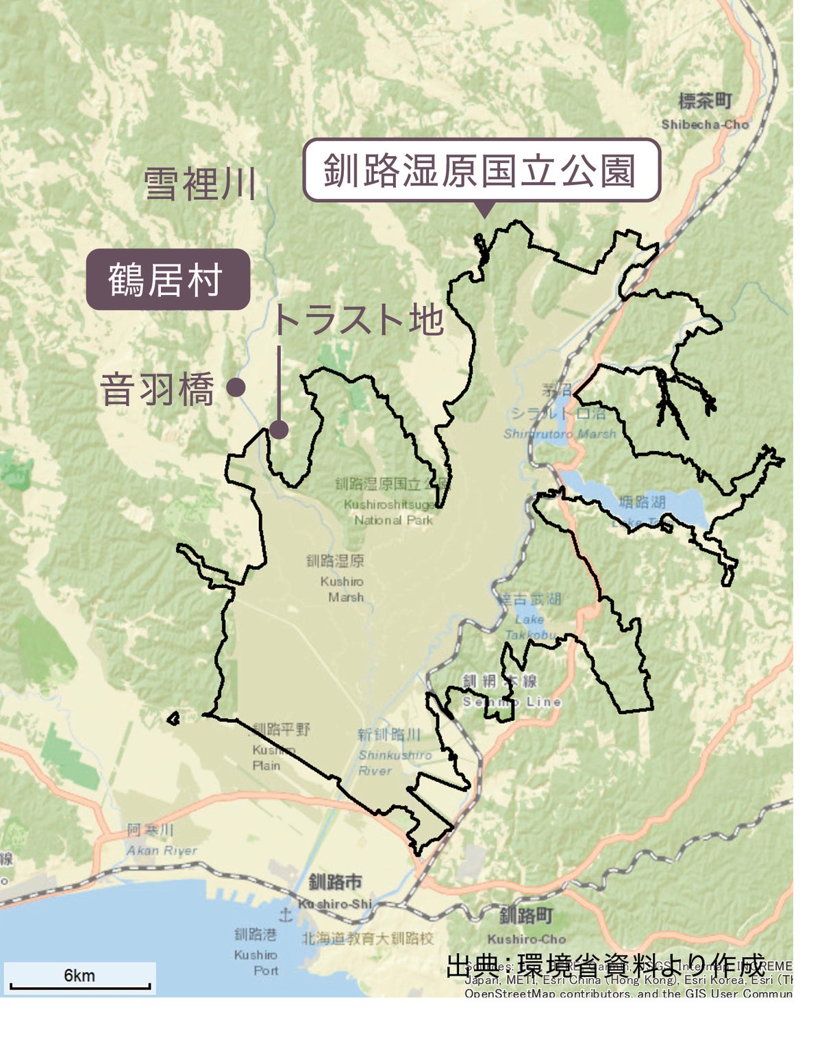 鶴居村を流れる雪裡(せつり)川は、真冬でも川が凍らないため、国の特別天然記念物タンチョウの貴重なねぐらとして有名です。この川にかかる音羽橋は、早朝、飛び立つ前のタンチョウの姿を見ようと、国内外から多くの観光客が訪れるスポットとなっています。今回取得した丘陵地は、この音羽橋からの重要な景観の一部であると同時に、タンチョウをはじめとする野生生物の生息環境と密接に関わる地域です。