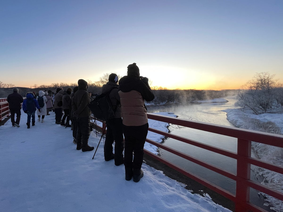 冬の早朝、飛び立つ前のタンチョウの姿を見ようと多くの観光客やカメラマンが音羽橋を訪れる。川の向こうに見える丘陵地の一部が取得地。