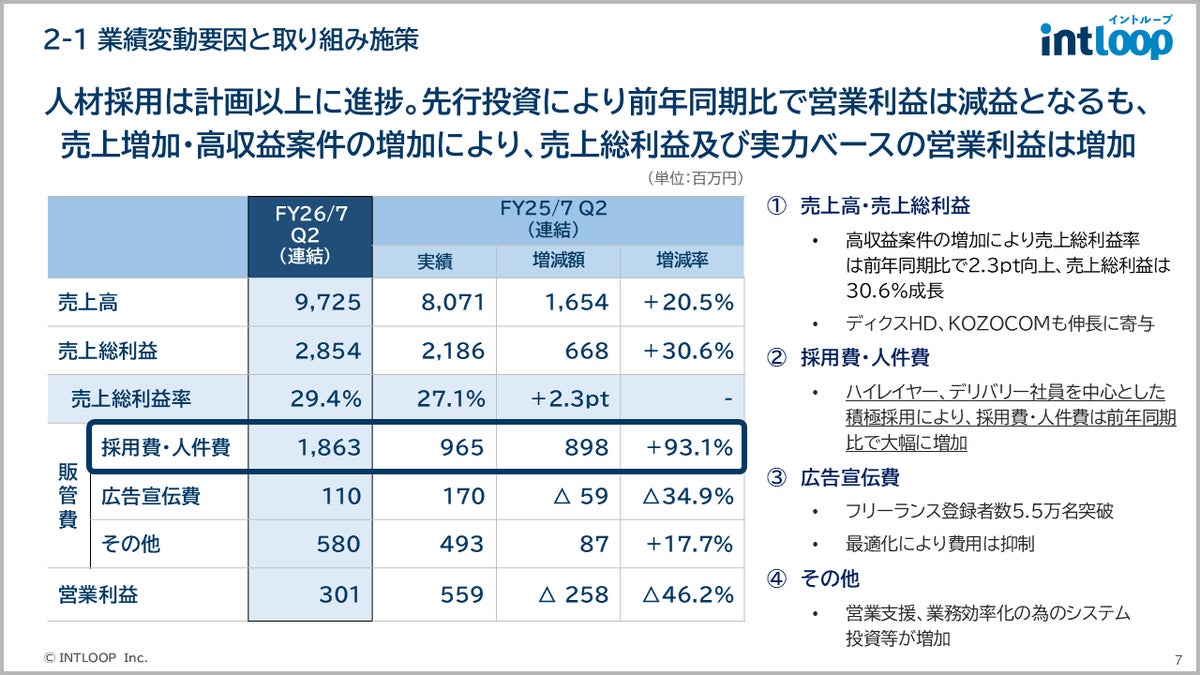 - 前期に引き続き、中長期経営計画「INTLOOP“VISION2030”」のもと高収益案件獲得に注力し、売上総利益率が29.4%と前年同期を上回る水準に成長