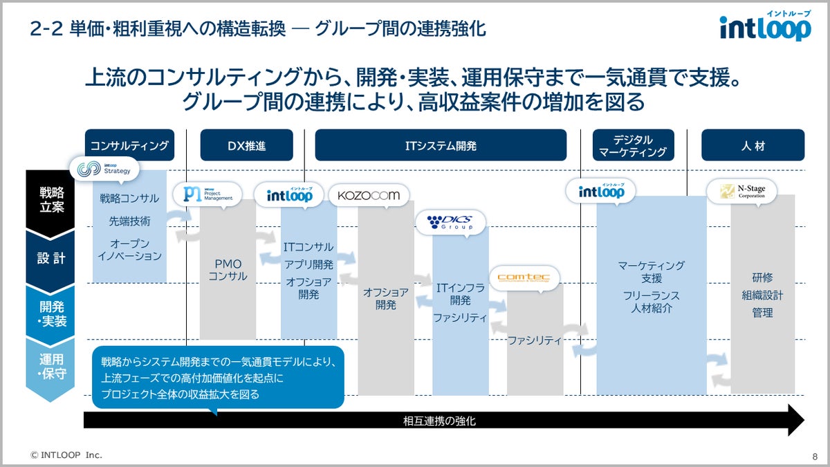 グループ間の連携により、上流のコンサルティングから開発・実装、運用保守まで一気通貫で支援するモデルを実現しています。上流フェーズでの高付加価値化を起点にプロジェクト全体の収益拡大を図り、高収益案件を拡大してまいります。