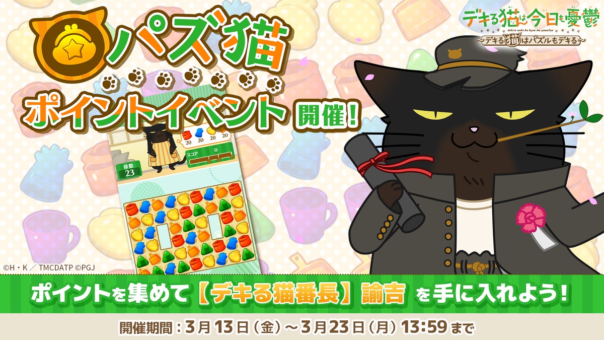ポッピンゲームズジャパン株式会社(本社:東京都港区、代表取締役 CEO:谷口祐一郎)は、TV アニメ「デキる猫は今日も憂鬱」(略称:デキ猫)の新作スマートフォン向けパズルゲーム「デキる猫は今日も憂鬱~デキる猫はパズルもデキる~」(略称:パズ猫)がゲーム内イベントを開催することをお知らせいたします。