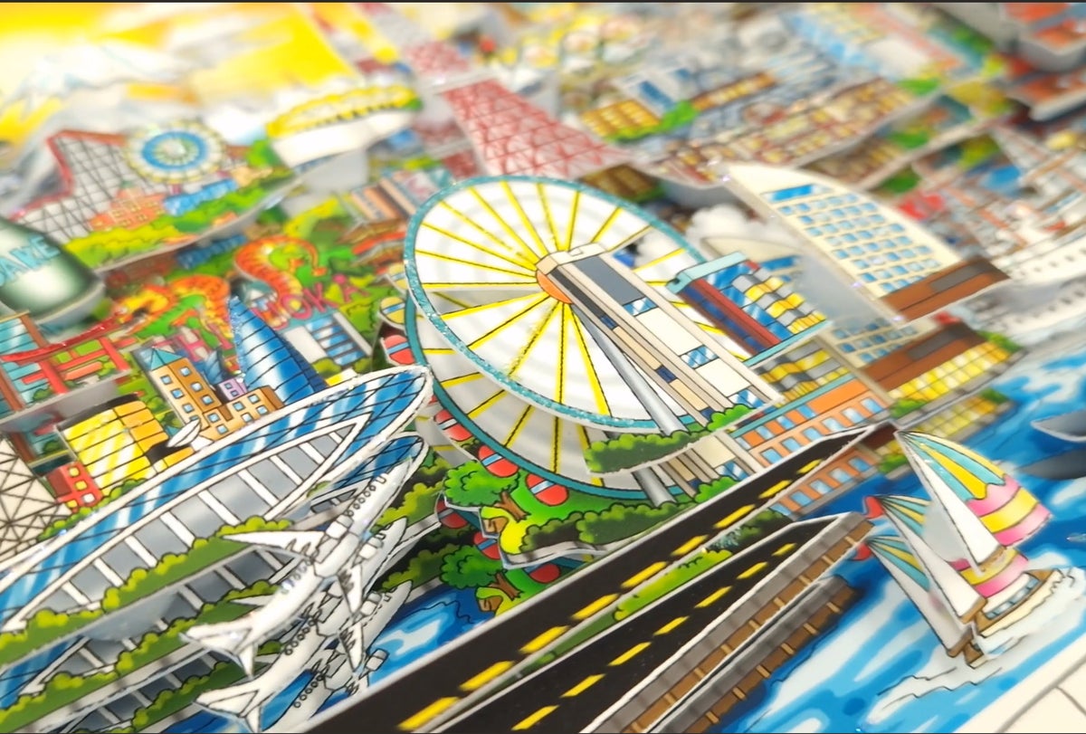 彼の作品は、複数枚の版画をパーツごとに切り分け、シリコンを用いて手作業で積み重ねる独自の「3Dレイヤリング技法」により制作され、仕上げにはラメやスワロフスキー・クリスタルが施され、平面作品では味わえない奥行きと輝きを放っている。