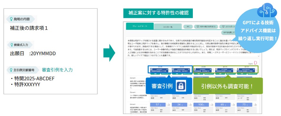 AI Samurai ONEの審査シミュレーションに追加された『拒絶理由通知』対応機能と『IDEA BOX』機能を併用することで、補正案のご提案から、意見書・補正書の作成まで、一連の対応をシームレスに実施していただくことが可能となりました。