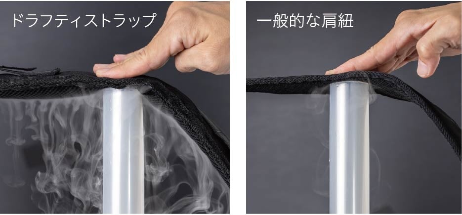 「ドラフティ」は、最大の特徴である、特許出願中の新構造「ドラフティ・ストラップ」から名付けられました。