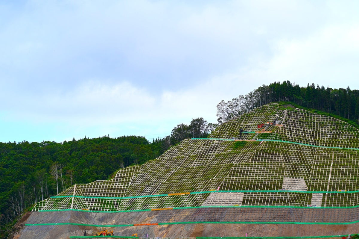 選定理由:雄大な自然と人の営みが交差する瞬間を的確にとらえた作品です。山肌を覆う法面工の規則的な直線が、周囲の深い緑や広い空と美しい対比を生み、土木構造物の機能美と風景の調和を印象的に表現されている作品です。