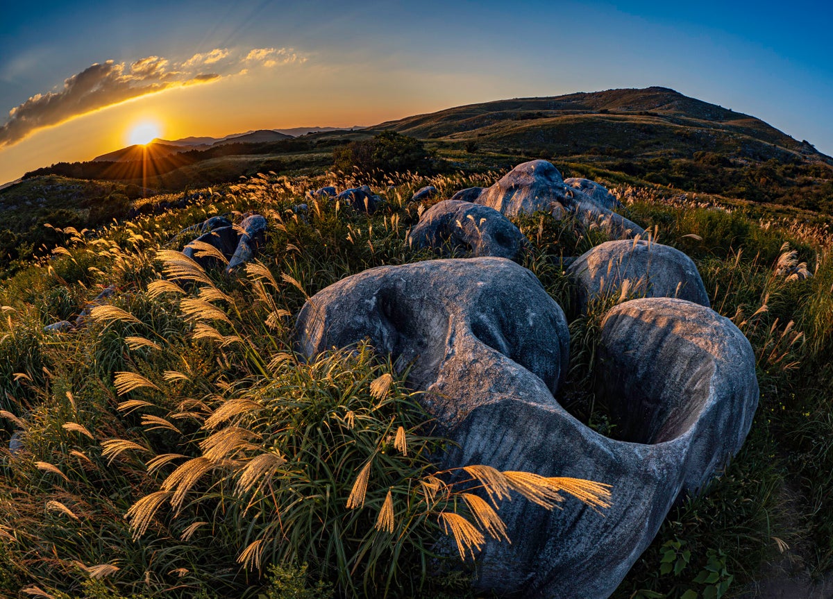 選定理由:夕暮れの光に照らされ、美しく輝く羊群原の瞬間を見事に捉えた一枚です。夕焼けに染まる石肌と一面のススキが織りなす情景は静謐かつ神秘的で、自然の息吹と時間の移ろいを感じさせる素晴らしい作品です。