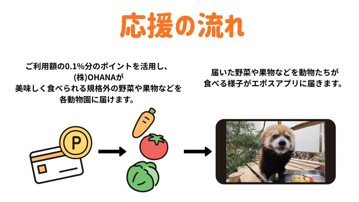本カードは、お買い物でのご利用金額に応じた加算ポイント(200円につき1ポイント・還元率0.5%)から、ご利用金額の0.1%分を、お客さまから動物たちの「お食事代」として届けることで、動物たちとの絆を感じることができるカードです。会員のお客さまは、ご自宅などお好きな場所で、送られた農産品を実際に動物たちが食べる「お食事動画」をエポスアプリよりご視聴いただくことができます。