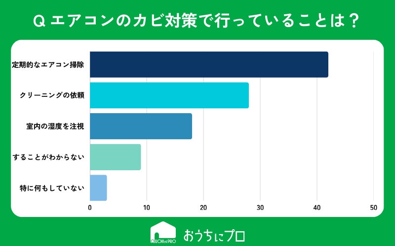 - エアコンのカビ対策として実施していることは「定期的なエアコン掃除」や「エアコンクリーニングの依頼」。