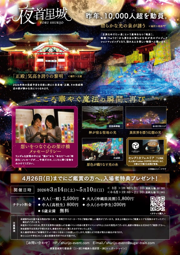 2026年3月14日(土)から5月10日(日)までの期間、夜首里城実行委員会(一般財団法人沖縄美ら島財団・ 株式会社シュガートレイン)は、首里城公園にて夜間特別イベント「夜首里城 YORUSHURIJO」を開催いたします。本イベントは、夜の首里城をライトアップやプロジェクションマッピングなどの光で彩る