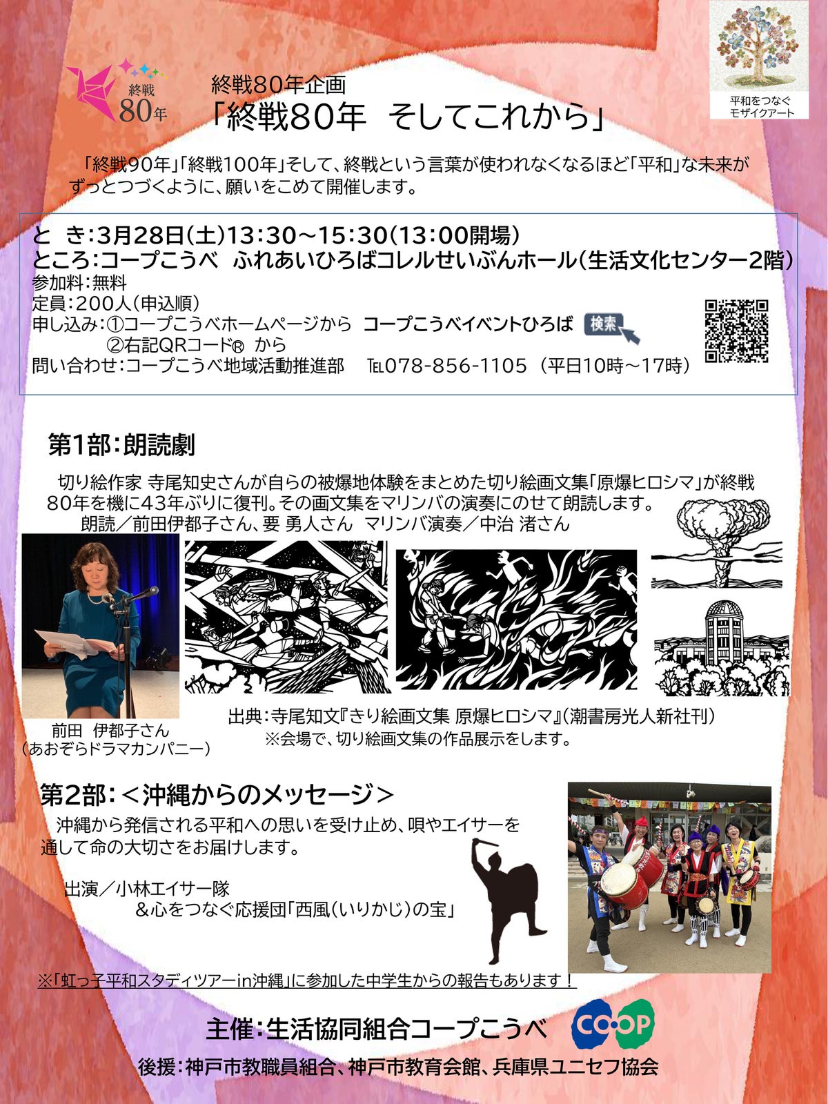 生活協同組合コープこうべは昨年、話題となった兵庫県養父市出身の絵作家 寺尾知文さんが自らが兵隊として被爆地ヒロシマでの体験をまとめた「きり絵画文集『原爆ヒロシマ』」の朗読劇を3月28日(土)に開催します。会場ではマリンバの演奏(中治 渚さん)にのせて、俳優の前田 伊都子さん(あおぞらドラマカンパニー)、要 勇人さんが朗読します。