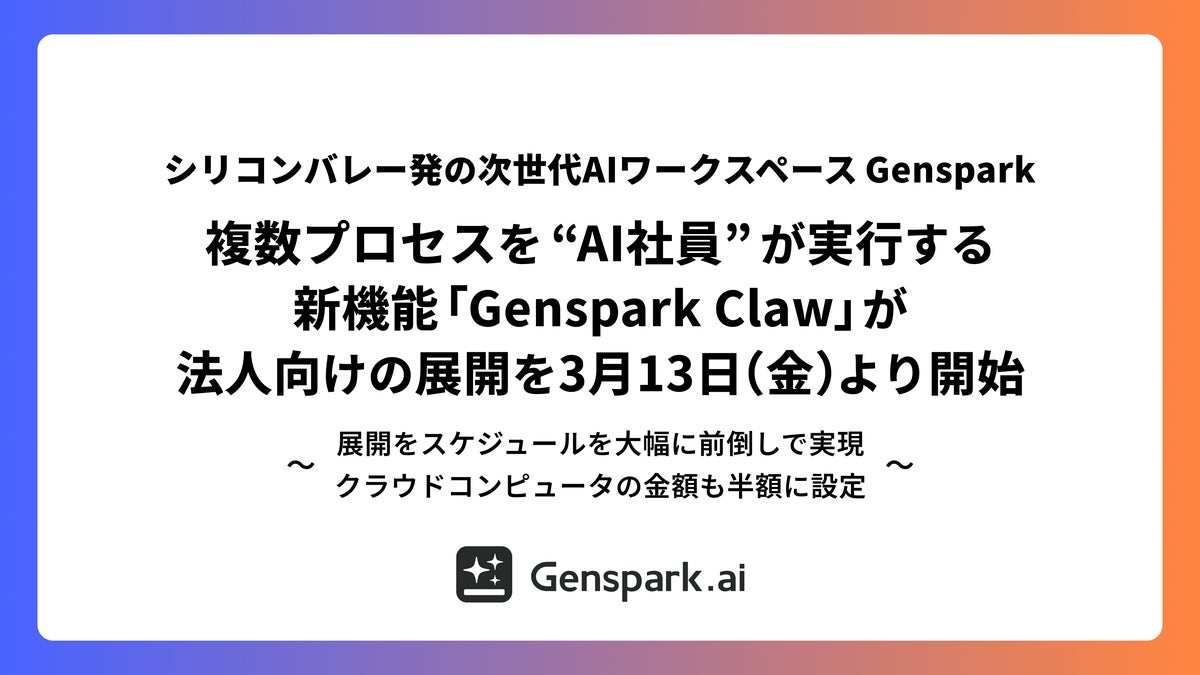 シリコンバレー発の次世代オールインワンAIワークスペース「Genspark(ジェンスパーク)」は、複雑な業務プロセスを “AI社員” が実行する新機能「Genspark Claw(ジェンスパーク・クロー)」について、法人向けの展開を2026年3月13日(金)より開始します。