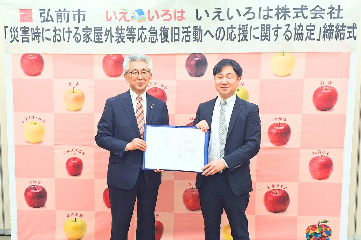 屋根・外壁工事店とエンドユーザーをつなぐポータルサイト「やねいろは」「かべいろは」を運営する、いえいろは株式会社(本社:岡山県岡山市南区・代表取締役社長:白神 康一郎、以下「いえいろは」)は、青森県弘前市(市長:櫻田 宏、以下「弘前市」)と、災害時における家屋外装等の応急復旧支援に関する協定を、2026年3月12日(木)に東北で初めて締結しましたので、お知らせいたします。