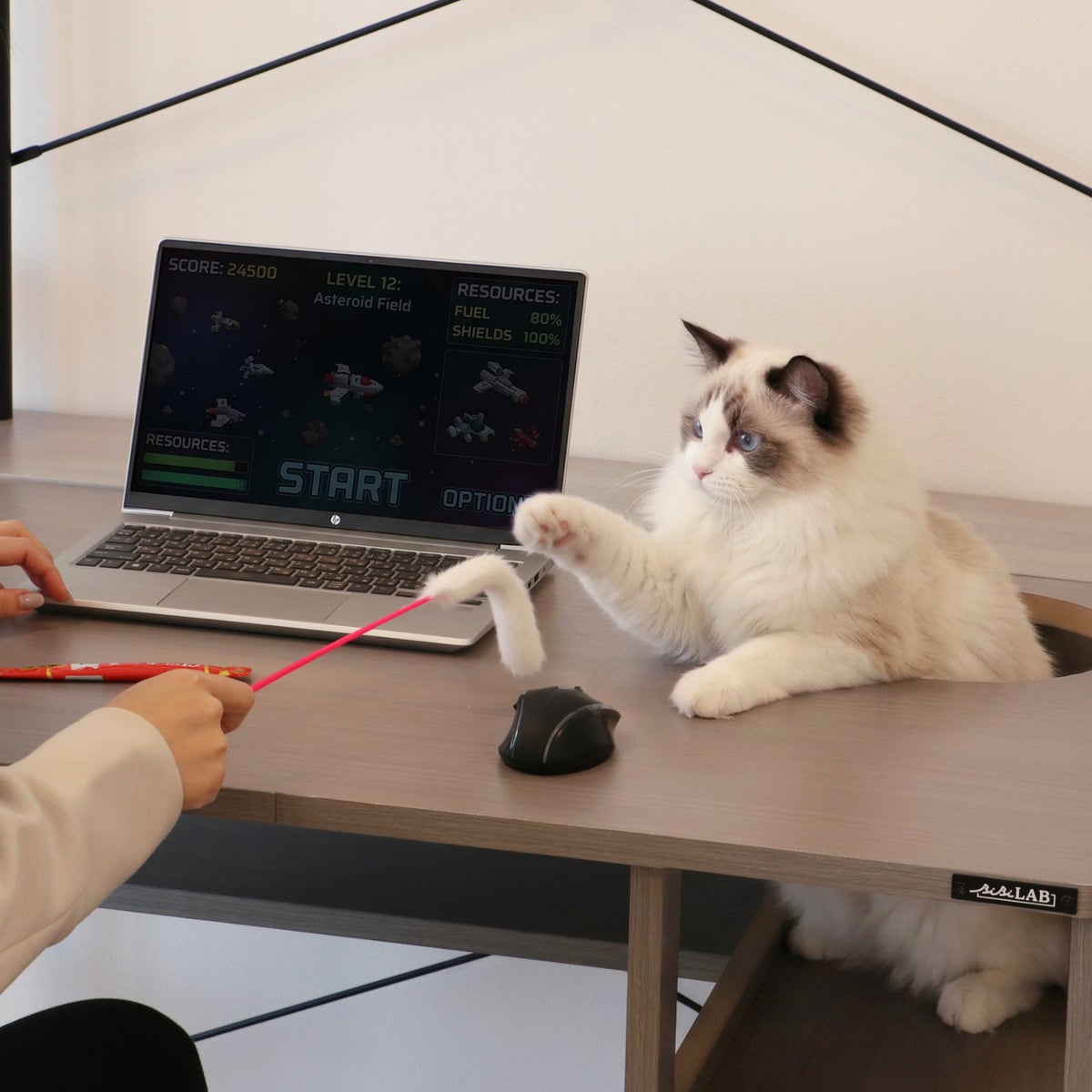 「構ってほしい猫」vs「ゲームに集中したい飼い主」。このかわいらしくも切実に困ってしまう紛争を終わらせるべく誕生したのが、猫がくつろげる&遊べる4つの【にゃんギミック】を搭載した、キャットハウス一体型パソコンデスクです。