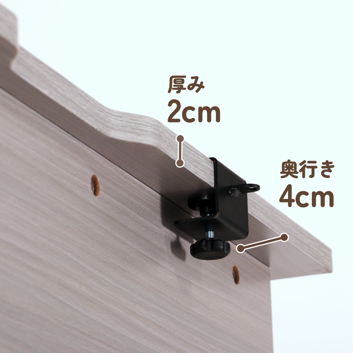クランプ取り付け対応 <隠れ猫スペース>の幕板(背板)をあえて手前側にずらすことで、市販のデスクアクセサリ用品のクランプが取り付けられる余裕を確保。