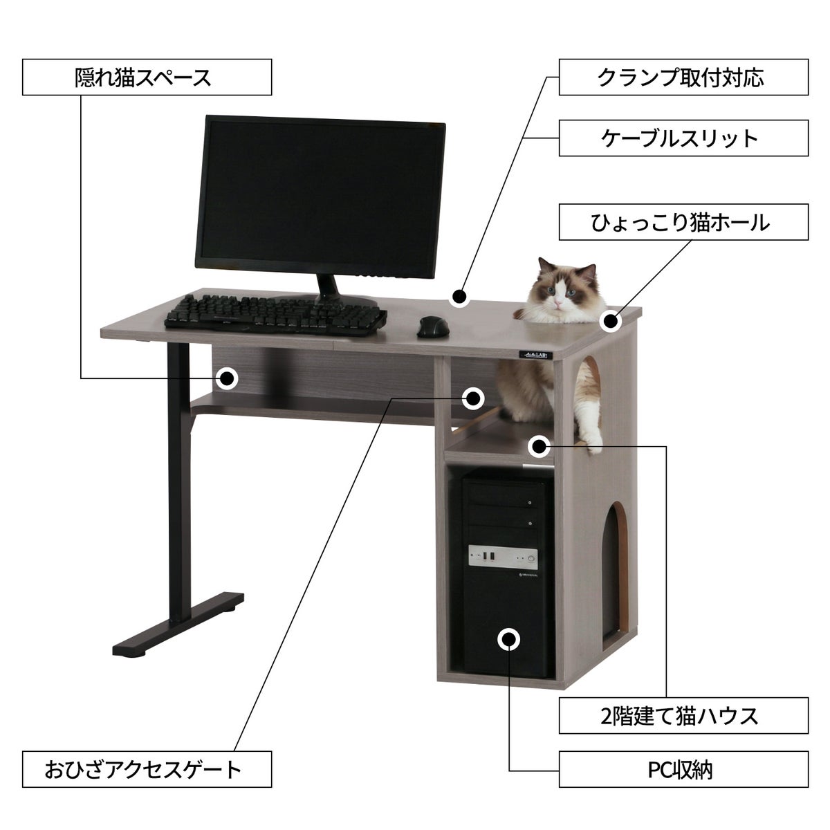 狭いところに潜り込みたいという猫の本能を誘引する<2階建て猫ハウス>&<隠れ猫スペース>を、PCデスクにドッキング。猫の専用スペースをあえて天板下に確保することで、机上のプレイ領域への侵略を防止します。猫ハウス下段はPC収納としても活用でき、ミドルタワーサイズのデスクトップパソコンをかわいい猫の魔の手から保護することが可能です。