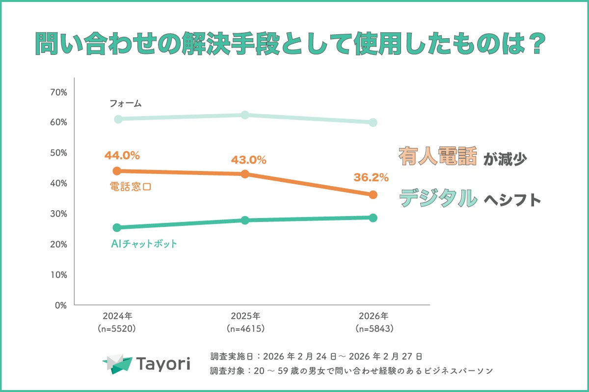 カスタマーサポート従事者の意識が変化する一方で、問い合わせをする側の生活者の行動にも変化の兆しが見えます。ここ1年で問題が発生した際の「解決手段」の定点推移を見ると、従来主流だった「電話窓口(有人対応)」を利用した割合が、44.0%(2024年)→ 43.0%(2025年)→ 36.2%(2026年)と明確に減少しています。