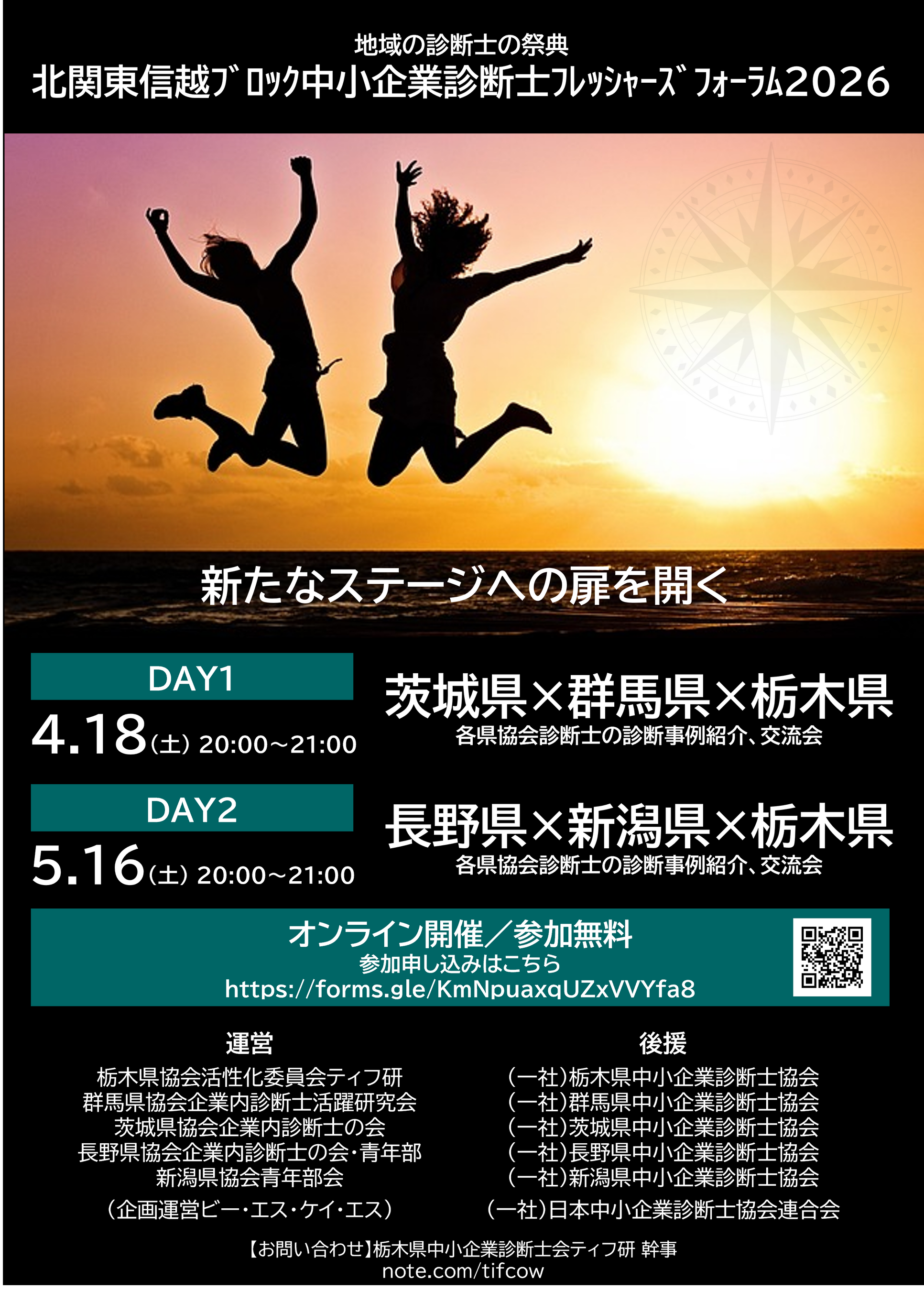 【2026年4月18日(土)、5月16日(土)オンライン開催】運営:栃木県中小企業診断士協会ティフ研・北関東信越ブロック診断士有志部会 後援:日本中小企業診断士協会連合会・北関東信越ブロック全県協会