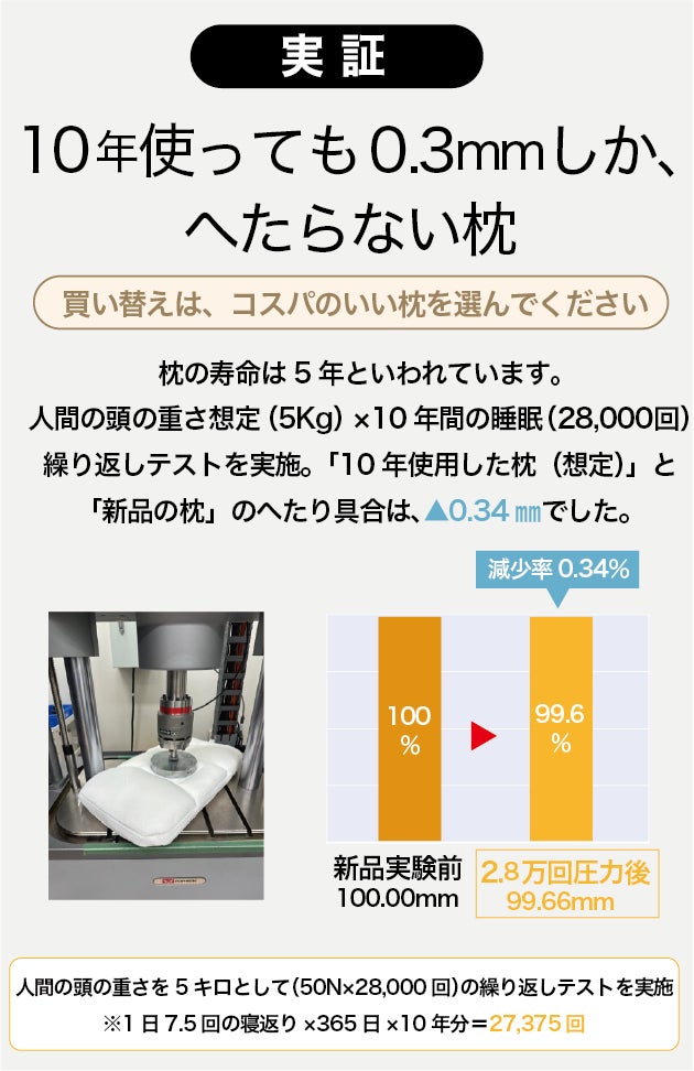 オーダーメイド枕は、28,000回の繰り返しテストを実施。10年使用した枕(想定)として、新品と比較したところ、実験後のへたり具合は、減少率▲0.34mmでした。