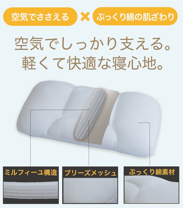 「空気でささえる」×「ぷっくり綿の肌ざわり」で、軽くて快適な寝心地枕の内部構造は