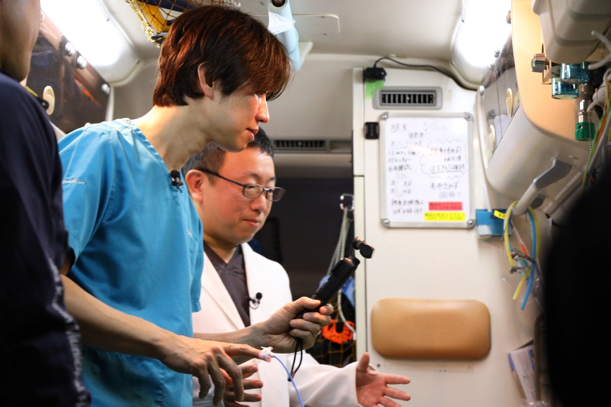 番組後半では、救急車の中に装備されている器具や装備を解説していきます。さまざまな医療器具が装備されていて、血液中の酸素飽和度を測る機械をつけてみたり、救急隊バッグの中身を見せてもらったりと、普段は見られない救急車の内部を、救急医&救命救急士に説明してもらうという流れ。見どころは、救急救命士でなければ乗ることはない、救急車の運転席も特別に公開! どのようにサイレンを鳴らしたり、救急灯を光らせたりしているのかという仕組みをしゅんPが体験リポートしていきます。