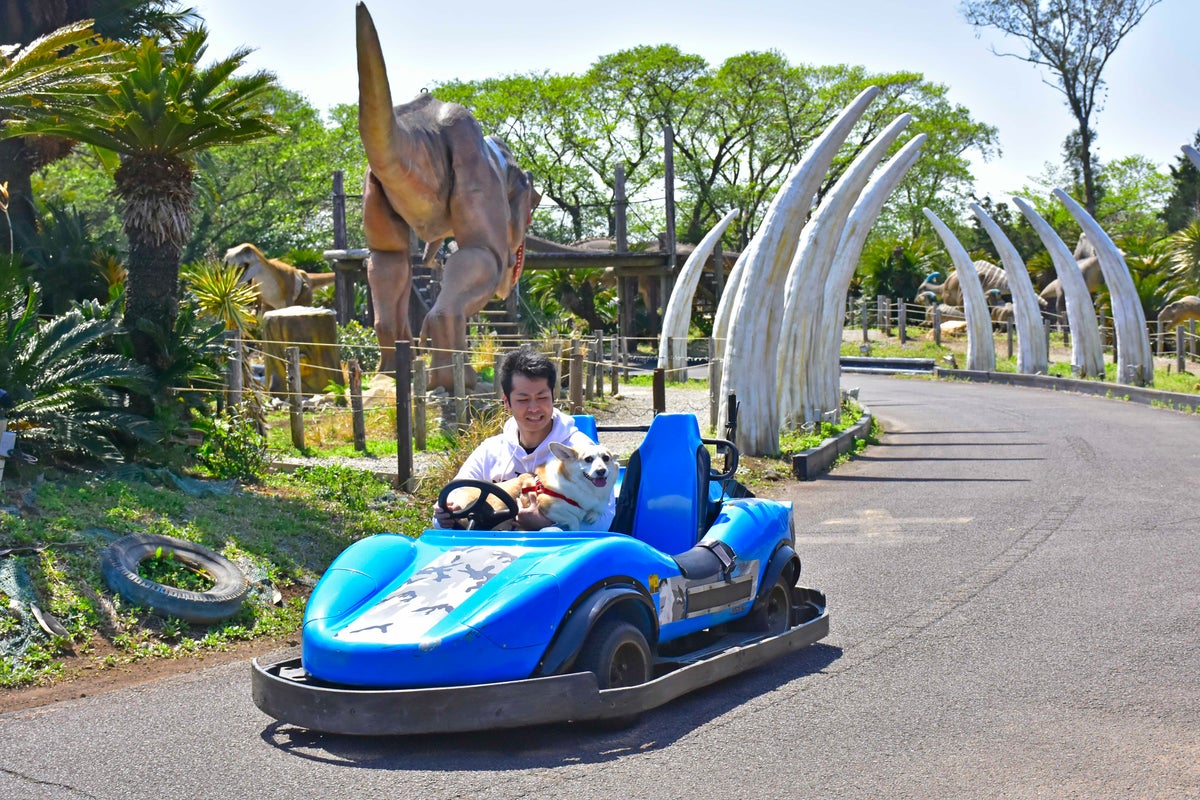 恐竜たちの間を走り抜ける迫力のゴーカート!
