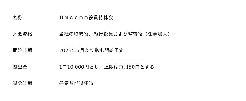 当社は、本日開催の取締役会において、当社役員等を対象とした持株会を設立し、2026年5月より継続的に当社株式を購入することについて決議いたしましたので、下記の通りお知らせします。