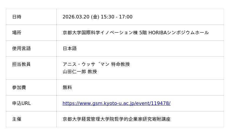 京都大学経営管理大学院主催の特別セミナー「AIエージェントは『企業家』の定義をどう変えるか ―シリコンバレーの現実と、経営の哲学的転換―」において、 弊社代表であり京都大学経営管理大学院特命教授のアニス・ウッザマンがスピーカーとして登壇いたします。